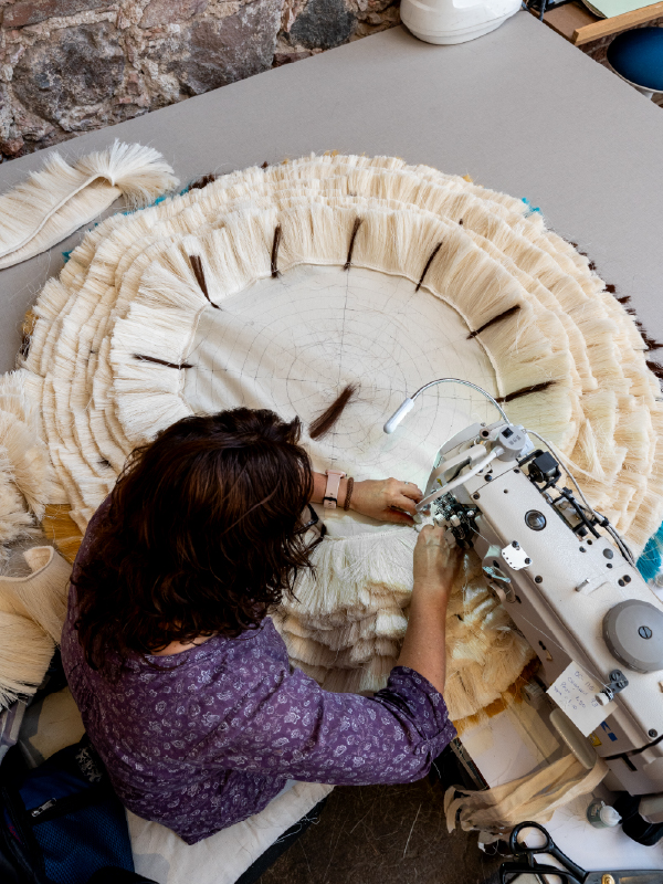 Tout commence par la matière première : fil de coton, fibre de sansevieria ou corne de taureau recyclée. Nous appliquons ensuite des techniques que nous avons perfectionnées au fil des ans, telles que les pompons, le tressage, le cordon ou les festons.